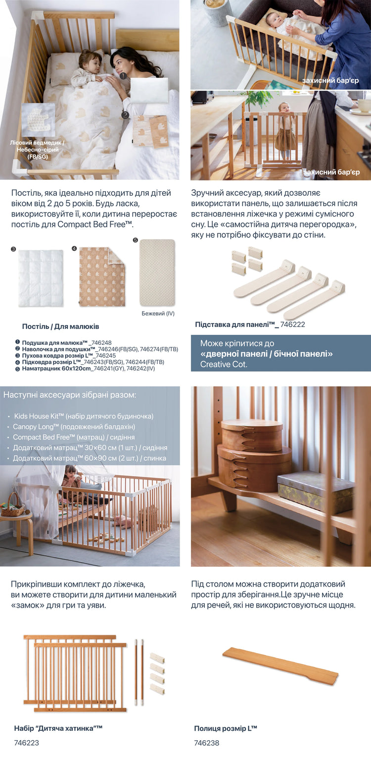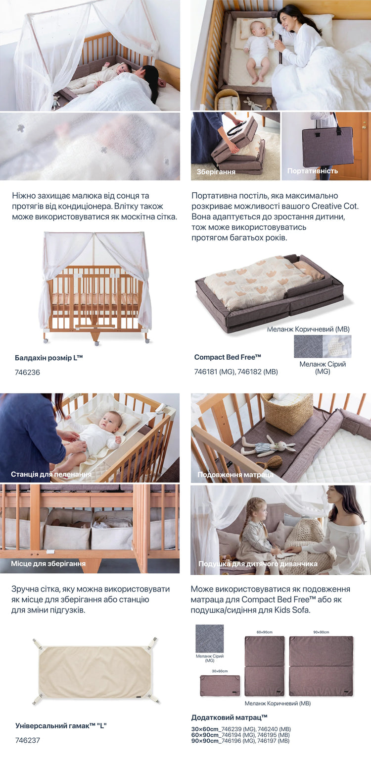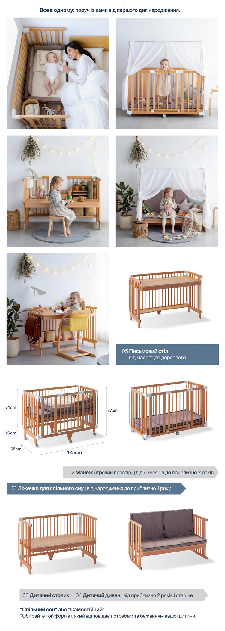 The patented 5-in-1 construction allows the cot to transform into a playpen, kids’ table, kids’ sofa and study desk as your child grows. Each detail - from lacquer finish to removable accessories - is designed for comfort, aesthetics and everyday usability.