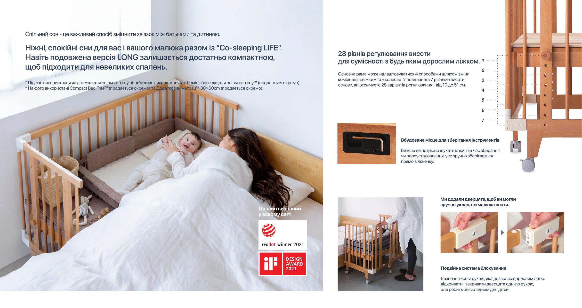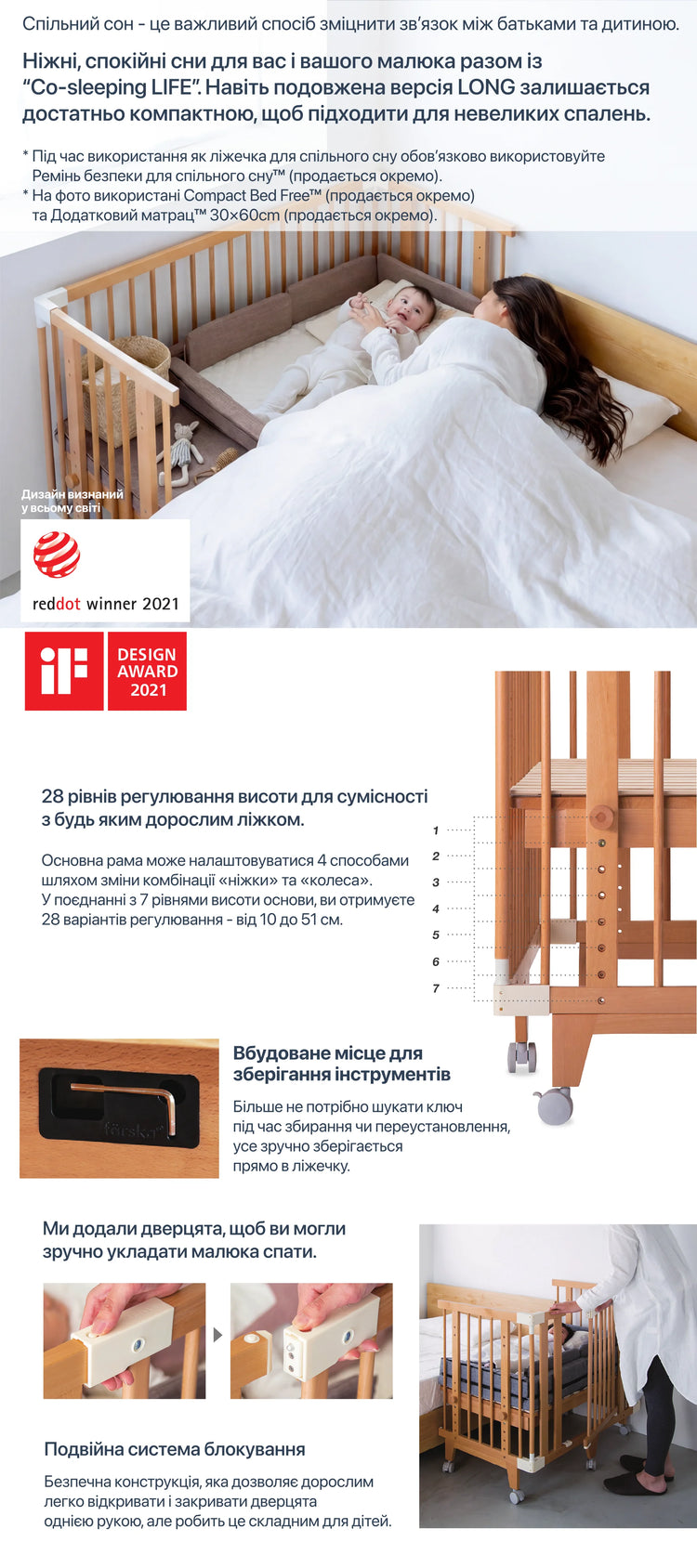 It offers 28 adjustable height settings to safely align with any adult bed for co-sleeping. A double-lock door system ensures parents can open it easily while remaining secure for children. All materials are tested for baby safety, and the solid beech structure ensures outstanding stability and durability.