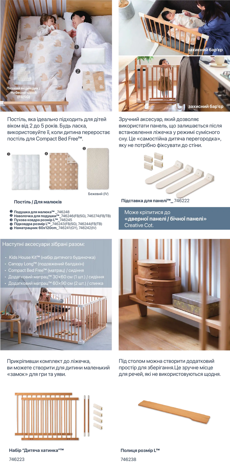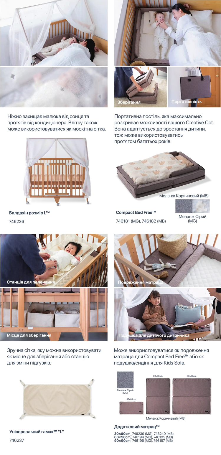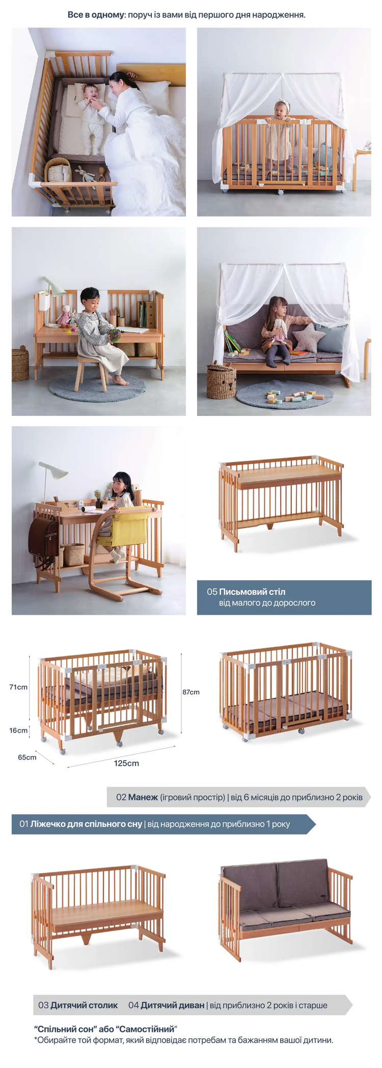 The patented 5-in-1 construction allows the cot to transform into a playpen, kids’ table, kids’ sofa and study desk as your child grows. Each detail - from lacquer finish to removable accessories - is designed for comfort, aesthetics and everyday usability.