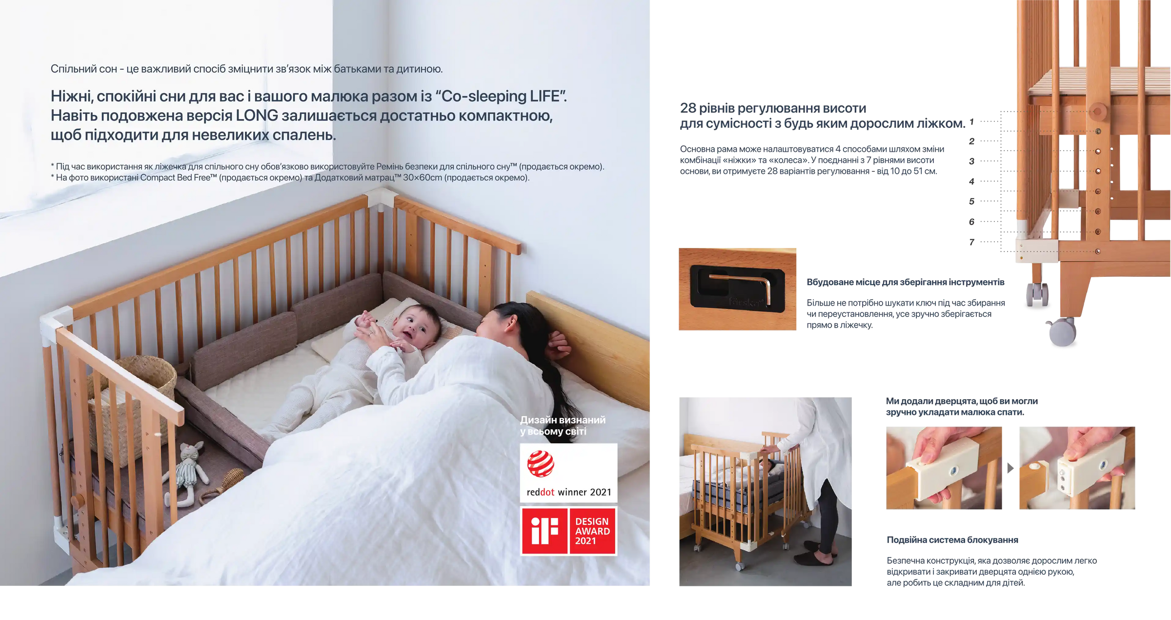 This is an innovative cot with no analogues. Its unique 5-in-1 concept is a patented technology by färska. The design transforms from a newborn cot into five different pieces of furniture and grows together with your child. A co-sleeping cot, playpen, kids table, kids sofa, or desk - this 5-in-1 system is the result of many years of färska’s development and innovation. The crib has earned global recognition, winning the Design Awards 2021 and the Red Dot Design Award 2021. We take great pride in its ease of assembly and the natural beauty of the product.