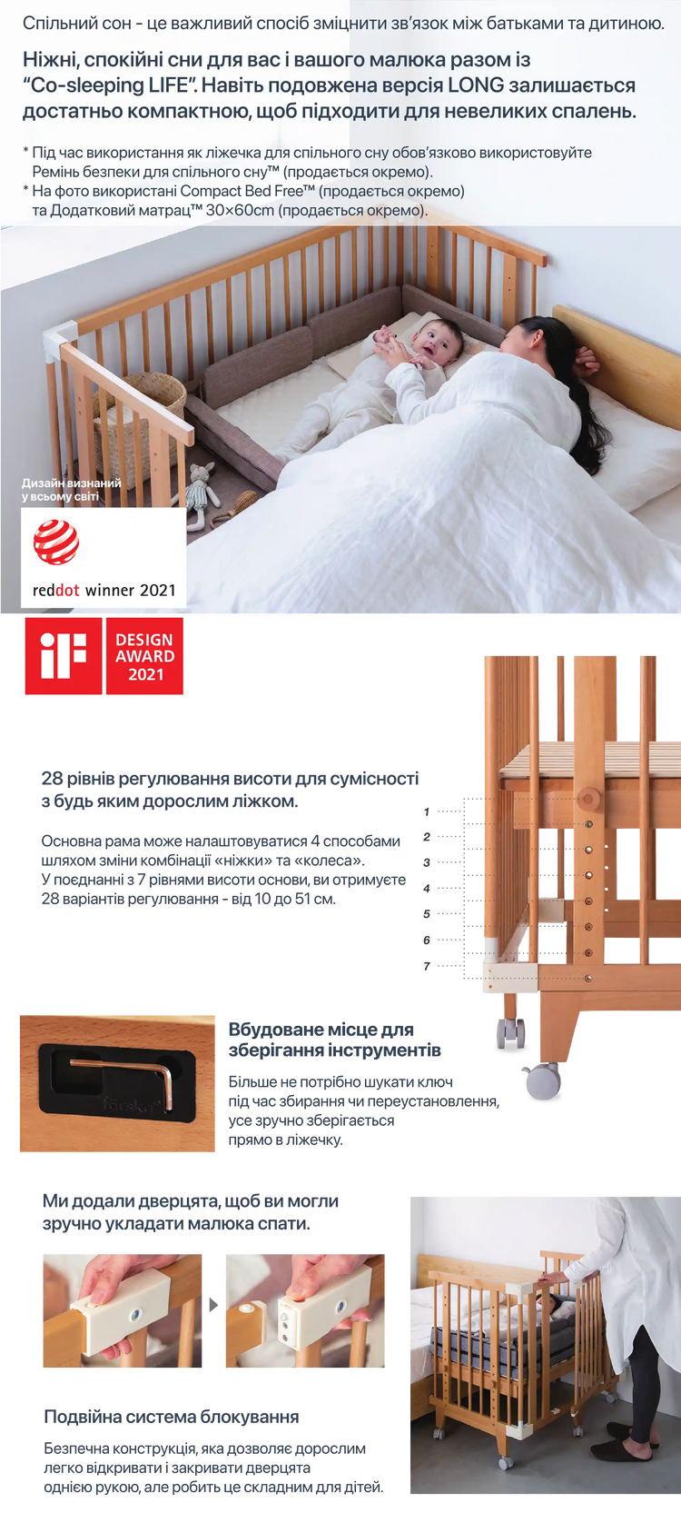 It offers 28 adjustable height settings to safely align with any adult bed for co-sleeping. A double-lock door system ensures parents can open it easily while remaining secure for children. All materials are tested for baby safety, and the solid beech structure ensures outstanding stability and durability.